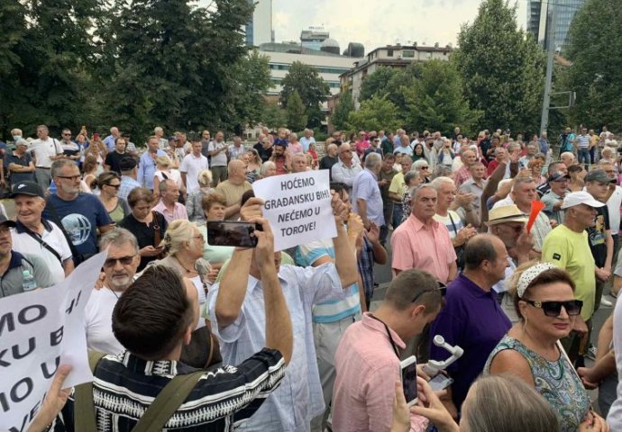 Okupljeni nose transparente na kojima piše: “Međunarodna mafija, podržava domaću mafiju”, “Hoćemo građansku BiH”, “Nećemo u torove”…