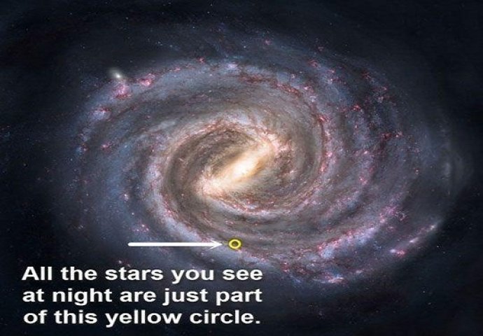 Mislite li da smo sami u kosmosu? Ove fotografije će vas natjerati na razmišljanje Svijet 16.10.15. 12:27 Ne žurite sa odgovorom, idemo na kratko putovanje... Kada noću pogledaš u nebo, žuti kružić sa slike je sve što ćeš vidjeti od Mliječnog Puta.