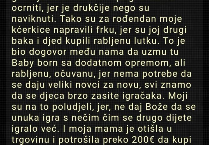 Kad dođu, samo gledaju kako će nešto prigovoriti ili ocrniti, jer je drukčije nego su naviknuti. Tako su za rođendan moje kćerkice napravili frku, jer su joj drugi baka i djed kupili rabljenu lutku. To je bio dogovor među nama da uzmu tu Baby born sa dodatnom opremom, ali polovnu, očuvanu, jer nema potrebe da se daju veliki novci za novu, svi znamo da se djeca brzo zasite igračaka. Moji su na to poludjeli, jer, ne daj Bože da se unuka igra s nečim čim se drugo dijete igralo već.