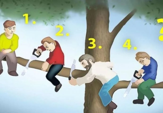 Najjednostavnija logika nam govori da je u ovoj situaciji nasigurnija osoba koja sjedi najbliže deblu. Naravno da je u prednosti u odnosu na one koji sjede daleko na granama. Po toj logici možemo zaključiti da je najmanje pametna osoba koja sjedi na najlošijoj poziciji. Iz takvog razmišljanja slijedi da su najgluplje osobe pod brojem 1 i 4. Pa ipak, to što osoba broj 4 izgleda kao da je primorana da si pili granu na kojoj sjedi - možda je sklona samoubijstvu - možemo zaključiti da je na neki način najmanje svjesna svoje loše pozicije i posljedica koje slijede. S druge strane, osoba 1 promatra mirno kako joj čak dvoje ljudi pili granu na kojoj sjedi kao da je posve nesvjesna onoga što slijedi - što nas dovodi do zaključka da je osoba 1 najgluplja.