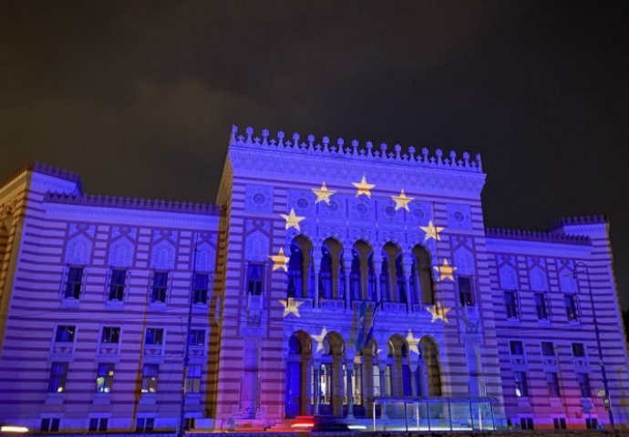 Povodom današnje odluke Evropske komisije u kojoj se preporučuje dodjela kandidatskog statusa Bosni i Hercegovini, Vijećnica u Sarajevu osvijetljena je u bojama zastave Evropske unije. Na ovaj način je Gradska uprava Grada Sarajeva simboličnim činom pozdravila potez koji su građani BiH dugo očekivali.