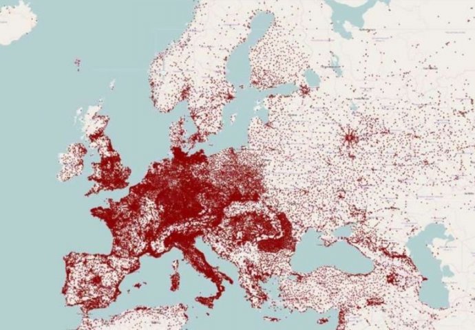 Naučnicii s Harvarda napravili su mapu evropskih država na kojoj svaka crvena tačka predstavlja jedno mjesto s više od hiljadu stanovnika.
