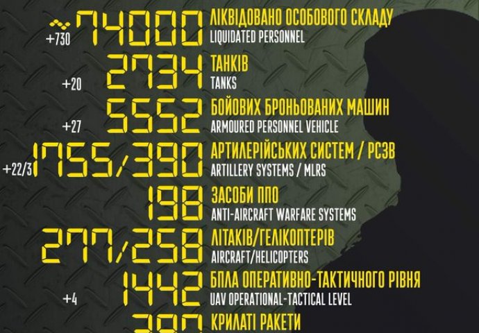 U današnjem izvještaju kažu da su samo u posljednja 24 sata ubili više od 750 ruskih vojnika. Također, Ukrajinci tvrde da su u jedan dan uništili preko 20 tenkova, ukupno dosad njih više od 2730.