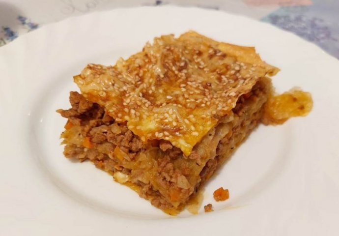 Najprije u tiganju propržite seckan crni luk i šargarepu. Kada omekša dodajte mljeveno meso i dinstajte dok se dobro ne uprži. Na kraju dodajte so, biber, mljevenu papriku, bosiljak i malo paradajz soka. U pleh stavite pek papir pa ređajte kore. Prvu i drugu koru premažite maslinovim uljem, a na treću stavljajte nadjev od mesa. Tako do utroška materijala. Posljednju koru premažite umućenim jajetom i pospite susamom. Pecite u zagrijanoj rerni na 200 stepeni oko pola sata.
