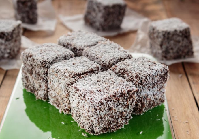 Biskvit sjeći kada se ohladi na kockice i umakati u mlaku glazuru, zatim uvaljati u kokos.