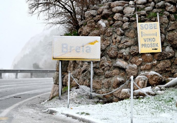 Zbog snijega i leda zatvoren je dio Jadranske magistrale od Piska do Donjih Brela, a prometnice je zabijelio snijeg.
