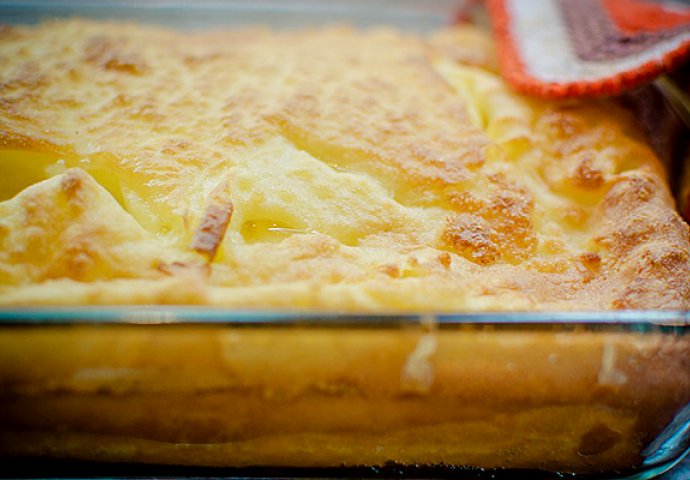 Kada se svi sastojci dobro promiješaju i izjednače dodaje se sitno izmrvljen sir. U veći pleh stavlja se smjesa koja je prethodno namazana s malo ulja.