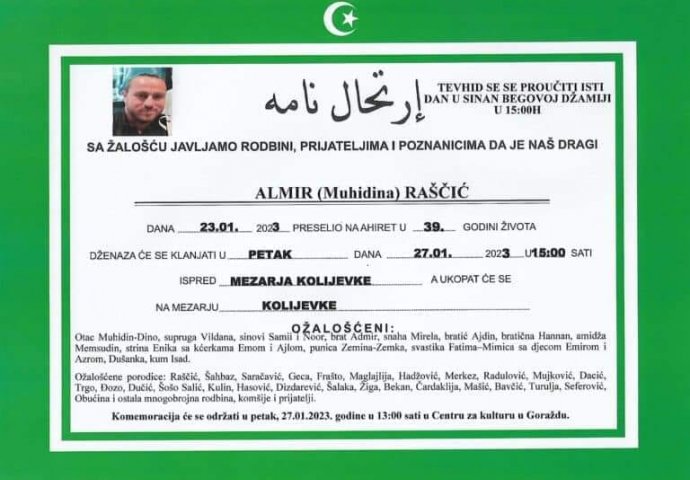 Dženaza će biti klanjana i ukop obavljen u petak, 27. januara u 15 sati na gradskom mezarju Kolijevke.
