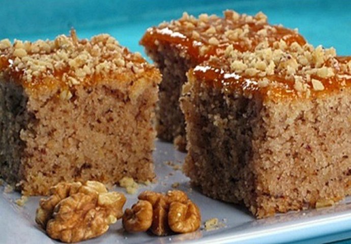 Pripremljenu smjesu pecite u pećnici zagrijanoj na 190°C 30 do 35 minuta. Pečeni kolač premažite džemom od marelica i pospite nasjeckanim orasima.