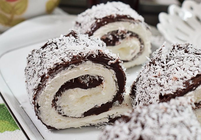 Nakon toga, nožem isijecite trake širine od oko četiri-pet centimetara, a zatim svaku traku na polovini dužine presijecite na pola. Krenite od ivice da savijate u rolat, tako da kokos ostaje sa spoljašnje strane. Budite vrlo nježni, da se kremasti kolač ne bi raspadao.