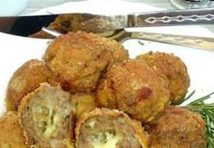 U rižu sipati kurkumu i lijepo izmješati praviti male loptice. Kackavalj( listice)podijeliti na četiri pa obaviti oko riže a zatim umotati u smjesu od mesa, pa u projino brasno. Staviti ih u nauljen sud i okrenuti na vatri da promene boju.