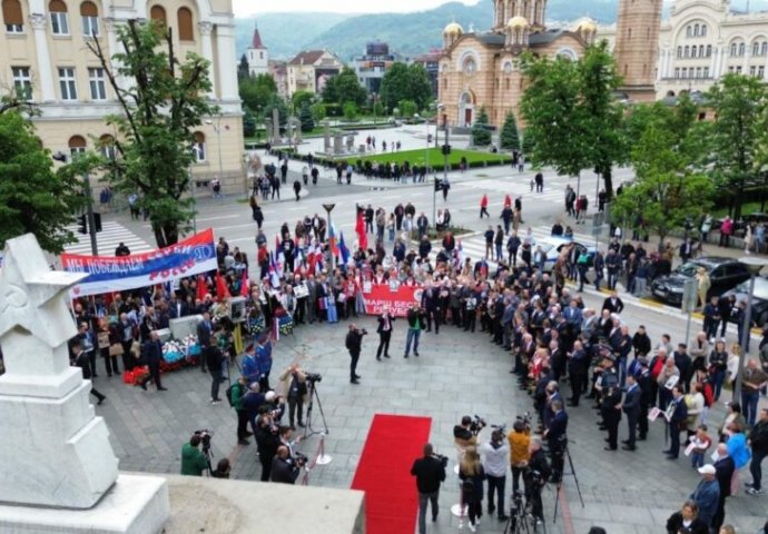 Vidljive su bile zastave Jugoslavije, Republike Srpske, obilježja Rusije, SUBNOR-a.
