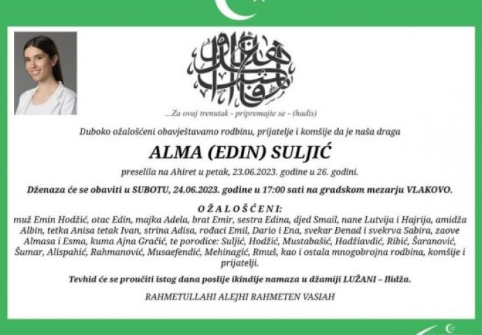 NEOPISIVA TUGA: Iza mlade doktorice Alme Suljić ostali muž, roditelji, brat i sestra