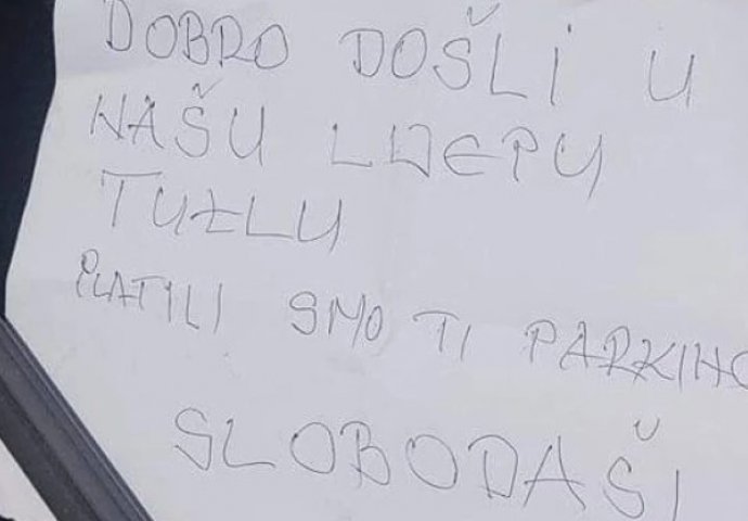 Na samoj slici se vidi poruka, gdje piše: "Dobro došli u našu lijepu Tuzlu. Platili smo ti parking", uz potpis 'Slobodaši'.