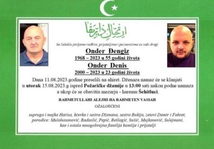 Otac i sin Đengiz i Denis Onder, koje je u petak u Gradačcu ubio Nermin Suljemanović, bit će ukopani danas na mezarju - haremu Šehitluci, a dženaza će biti klanjana ispred Požaričke džamije u Gradačcu u 13 sati.