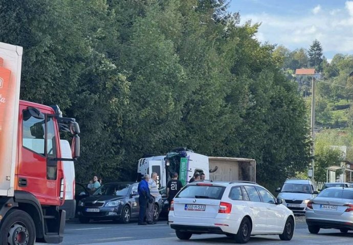 Uslijed jakog udara, kamion se prevrnuo na bočnu stranu.
