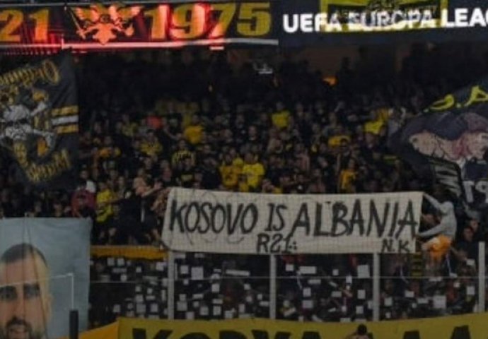 Navijači atinskog AEK-a su na meču protiv Ajaxa (1:1) tokom meča 2. kola Lige Evrope na stadionu istakli transparent „Kosovo je Albanija“.