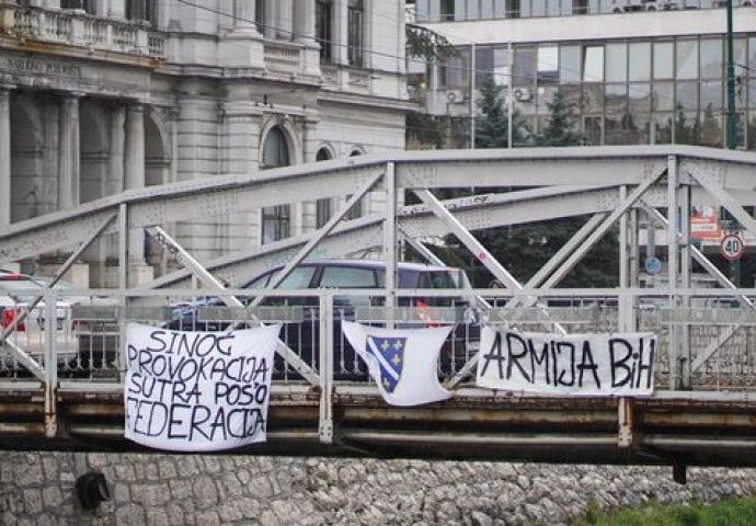 Na mostu "Čobanija" jutros su osvanuli transparenti na kojima piše "Sinoć provokacija, sutra pos'o Federacija" i "Armija RBiH".