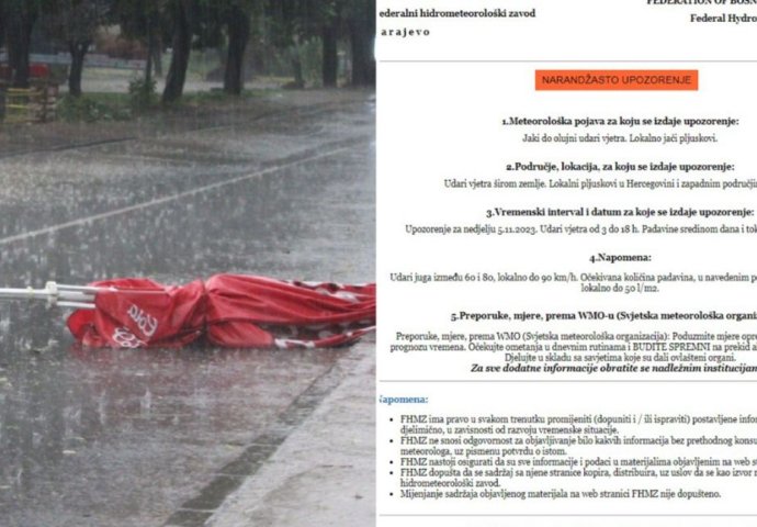 FHMZ je izdao narandžasto upozorenje zbog jakih do olujnih udara vjetra i lokalno jačih pljuskova. Udari vjetra se mogu očekivati širom zemlje do se lokalni pljuskovi mogu očekivati u Hercegovini i zapadnim područjima Bosne.