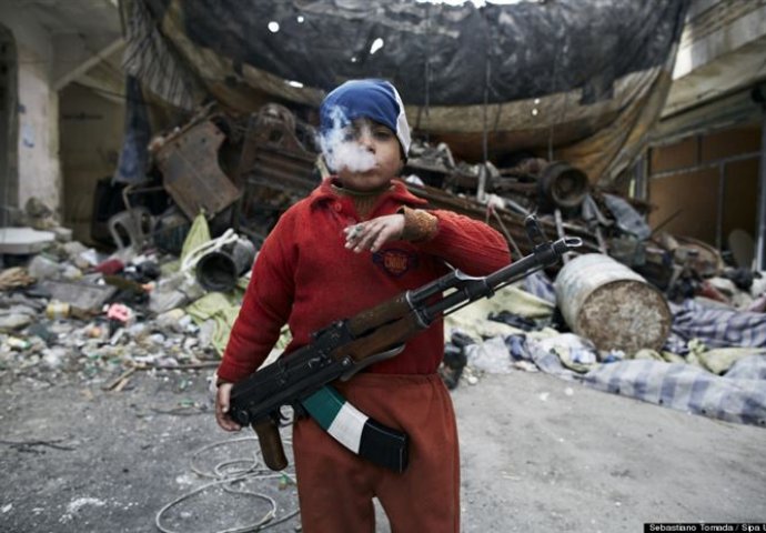 Sa samo 8 godina, sin sirijskog pobunjenika, stoji kao stražar sa kalašnjikovim na ramenu i puši cigaretu. Nažalost, ovo dijete bilo je primorano da prerano odraste.