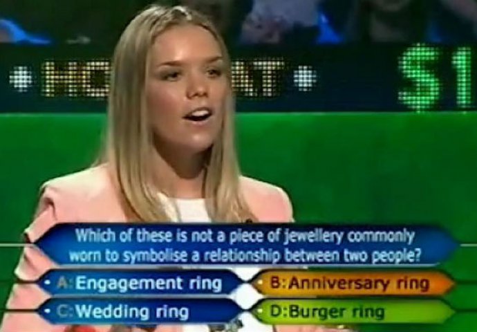 "Koji od navedenih komada nakita ne simbolizira vezu između dvoje ljudi?", glasilo je pitanje, a ponuđeni su odgovori bili: "Zaručnički prsten", "prsten za godišnjicu', "vjenčani prsten" i "burger prsten".