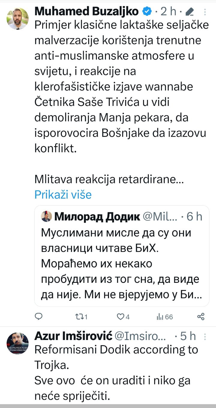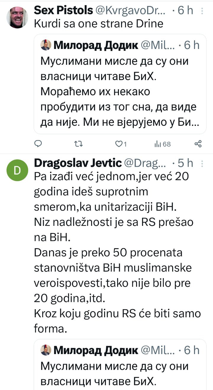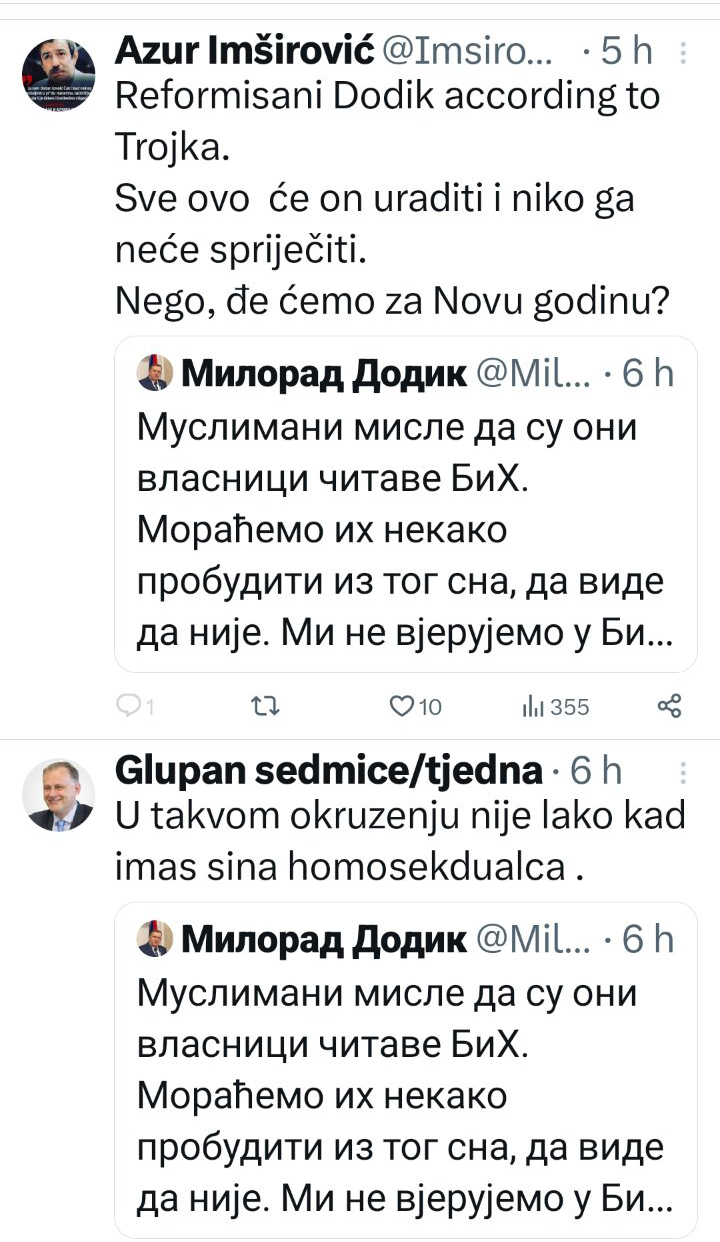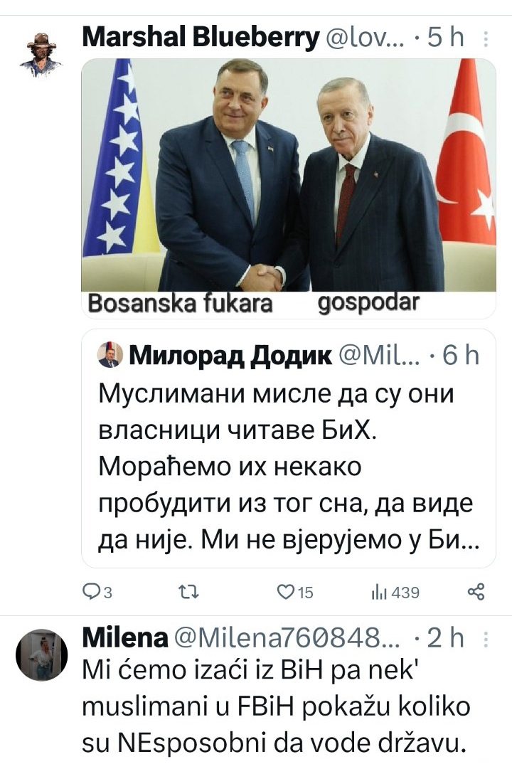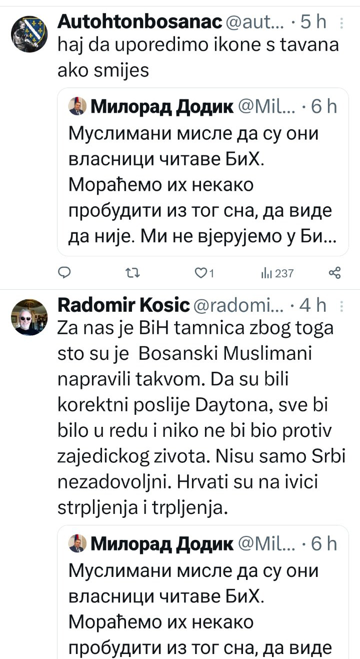 -Muslimani misle da su vlasnici cijele BiH. Morat ćemo ih nekako probuditi iz tog sna, da vide da nije. Ne vjerujemo u BiH. Ne volimo BiH. To je naša obveza. Ja bih više volio da, čim se ukaže prilika, Republika Srpska izađe iz Bosne i Hercegovine, poručio je Dodik na Twitteru.