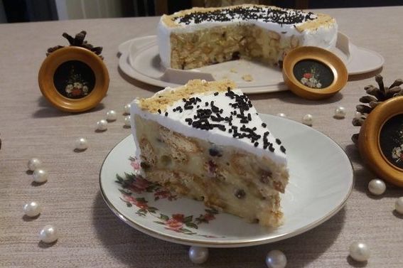 Ohlađeni krem izručiti u dublju vanglicu i mikserom ga umutiti. Iz dva puta dodati umućeni margarin i mutiti dok se ne dobije pjenasti krem. Ubaciti kokos i još jedanput umutiti. Zatim dodati mješavinu suvog grožđa i brusnica. Promiješati kašikom. Ubaciti banane, promiješati i na kraju dodati izlomljeni keks. Promiješati kašikom da se svi sastojci dobro sjedine.