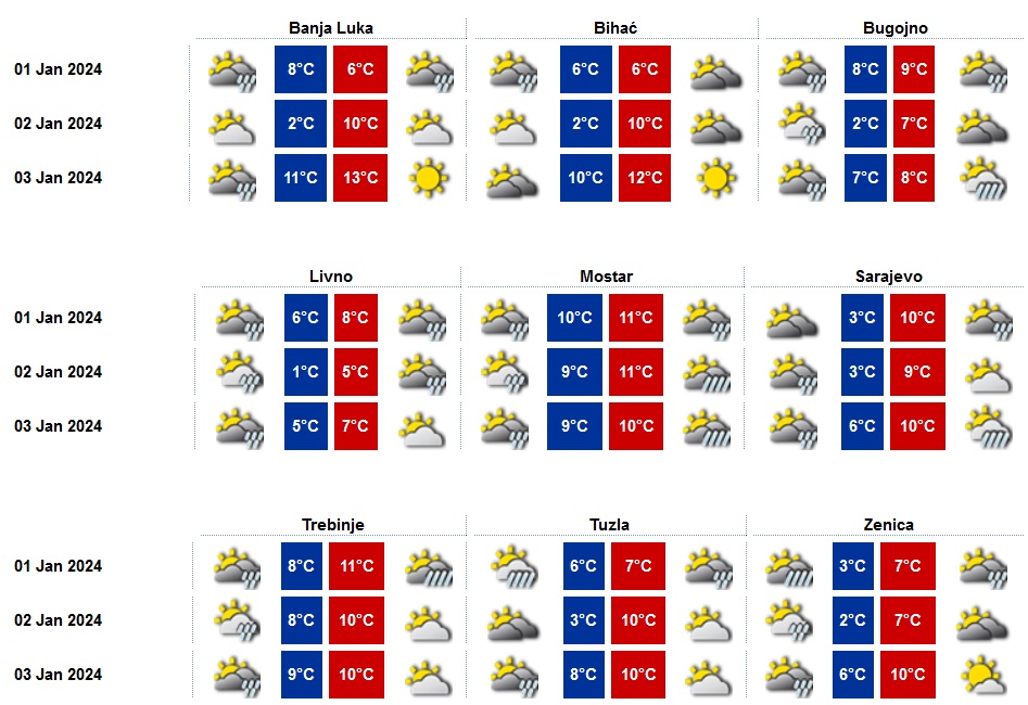 Prekosutra nas očekuje umjereno ili pretežno oblačno vrijeme. Kiša se očekuje povremeno u Hercegovini, sjevernim i istočnim područjima Bosne. Vjetar slab do umjeren južni i jugozapadni. Jutarnja temperatura zraka od 2 do 8, na jugu do 10, a dnevna od 10 do 16 stepeni.