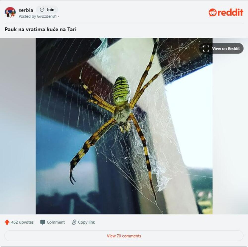 Na Redditu je jedan korisnik objavio fotografiju ogromnog pauka ose kog je uslikao na vratima kuće na Tari.