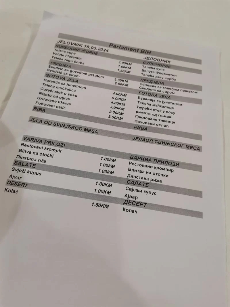Foto: Twitter: Cjenovnik iz restorana u Parlamentu BiH