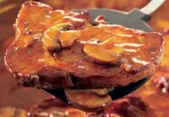 Oljušteni luk sitno nasjeckajte. Očišćene gljive narežite na ploškice. Meso operite i obrišite.