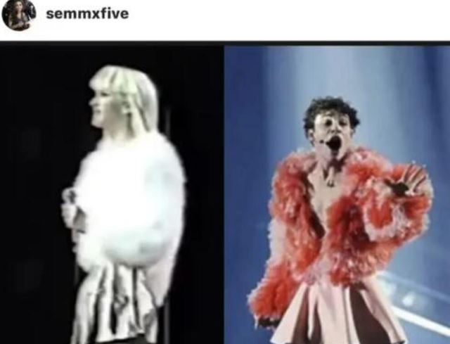 Osoba iz Švajcarske koja je odnijela pobjedu, Nemo, na pozornici je bio odeven u stajling koji podsjeća na Karleušin stajling od pre više decenija.
