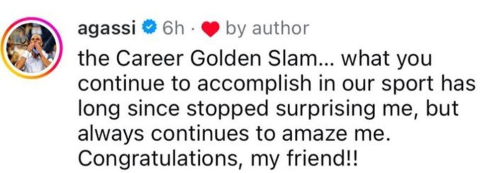 - Karijerni zlatni slem... Ono što ti nastavljaš da ispunjavaš u našem sportu je odavno prestalo da me iznenađuje, ali je oduvijek nastavilo da me zadivljuje. Čestitam, prijatelju moj - napisao je Andre Agasi u komentaru na Đokovićevu objavu na Instagramu.