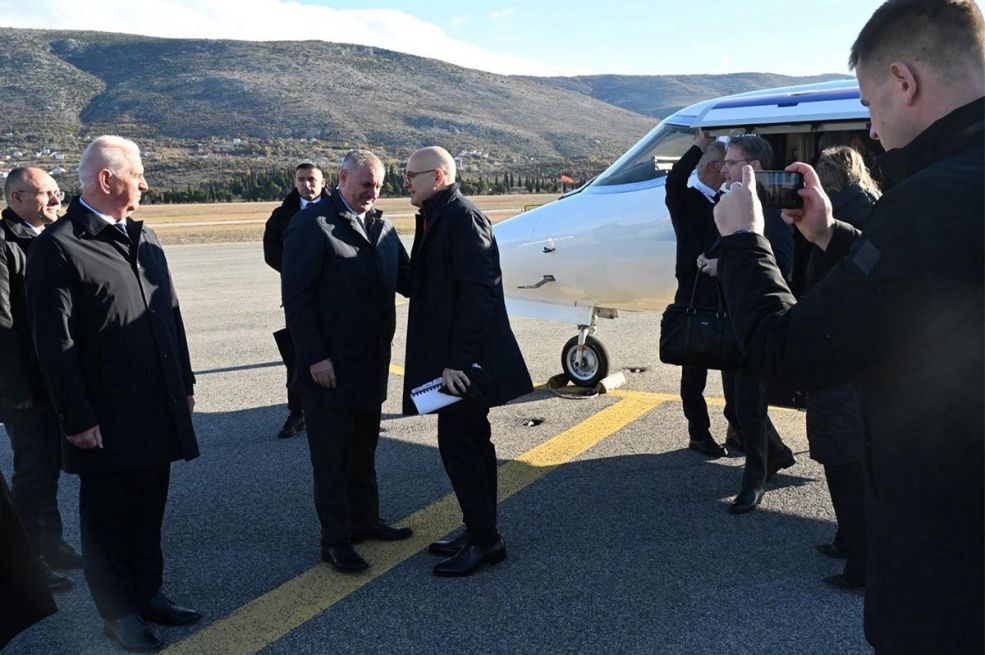 Predsjednik Vlade Srbije Miloš Vučević stigao je u Mostar odakle počinje posjetu Hercegovini, a na Aerodromu ga je dočekao premijer Republike Srpske Radovan Višković.
