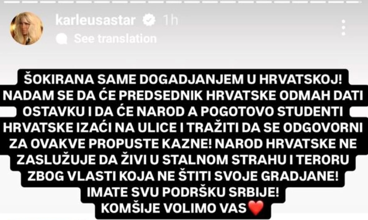Narod Hrvatske ne zaslužuje da živi u stalnom strahu i teroru zbog vlasti koja ne štiti svoje građane! Imate svu podršku Srbije! Komšije volimo vas", ironično je napisala Karleuša, koja je i ovu priliku iskoristila da botuje za SNS, aludirajući na hrvatske javne ličnosti koje su se oglašavale u jeku ubistva u 'Ribnikaru', piše Nova.rs.