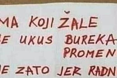 Vlasnik buregdžinice objasnio je zašto se ukus njegovih proizvoda promijenio: Slika je hit u regionu Kiosk 31.01.25. 16:57 Jeste li za burek ;)? Nakon što je očigledno određen broj prigovora na promenjen ukus bureka, vlasnik lokala iz Srbije gostima je porukom ispred lokala odlučio da objasni o čemu se radi. Ko ne bi imao razumijevanja za ovakvo objašnjenje? .. ..