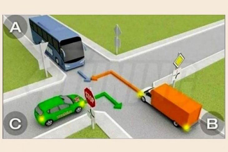Pogledajte ovu raskrsnicu na kojoj se nalaze kamion na putu sa prvenstvom prolaza, automobil i autobus.