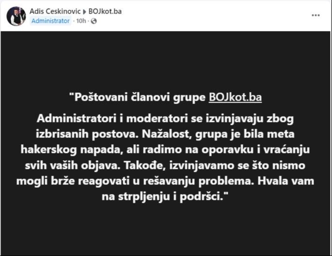 Takođe, izvinjavamo se što nismo mogli brže reagovati u rješavanju problema. Hvala vam na strpljenju i podršci", napisali su administratori Facebook grupe BOJkot.ba.