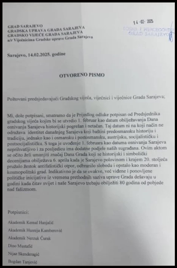 Grupa bosanskohercegovačkih intelektualaca, političkih zvaničnika, javnih ličnosti, antifašista, građana Sarajeva i Bosne i Hercegovine, uputila je danas Otvoreno pismo Gradskoj upravi i Gradskom vijeću Sarajeva povodom Prijedloga Jasmina Ademovića, predsjedavajućeg Gradskog vijeća Sarajeva, u funkciji gradskog vijećnika, i Vedada Deljkovića, gradskog vijećnika i dopredsjedavajućeg Općinskog vijeća Stari Grad Sarajevo, da se 1. februara obilježava kao Dana osnivanja Sarajeva.