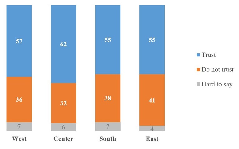 Stanovici južne i istočne Ukrajine izražavaju nešto niže povjerenje u Zelenskog, vjeruje mu njih 55 posto.
