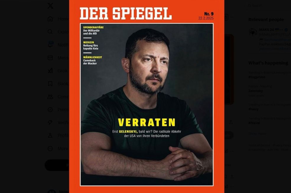 Na naslovnici sutrašnjeg izdanja Der Spiegela nalaziće se fotografija ukrajinskog predsjednika Volodimira Zelenskog uz poruku: "Izdan. Prvo Zelenski, onda mi? Radikalno udaljavanje SAD-a od svojih saveznika."