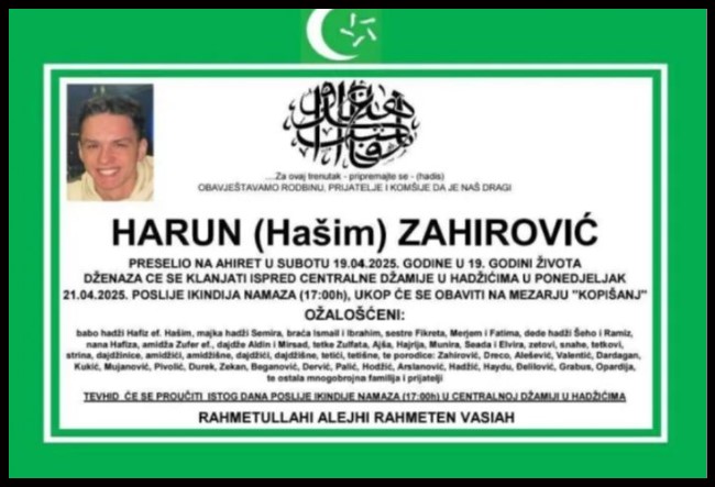 Od Haruna se opraštaju njegovi prijatelji i poznanici na društvenim mrežama. Inače, on je bio sin Hašima Zahirovića, bivšeg imama u džematu Divičani.
