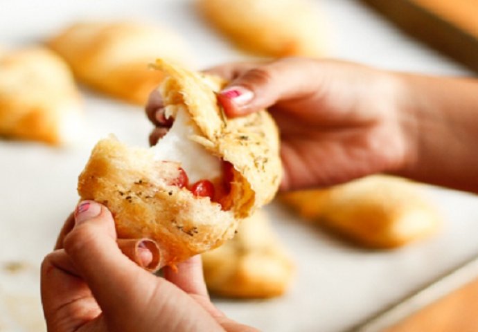4. Svaki dio posebno razvucite na što veći krug, zatim podijelite na 12-16 trouglova. Na svaki trougao stavite kečap, šunku, kačkavalj i origano, pa urolajte u kiflu.