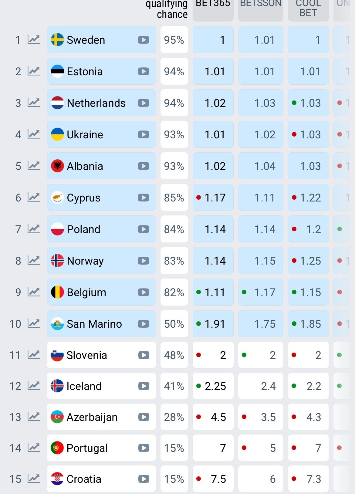 Na kladionicama za prolazak u finale, predstavnik Hrvatske, Marko Bošnjak, trenutno je na zadnjem mjestu. Kladionice predviđaju da u finale neće ući ni Portugal, Azerbajdžan, Island i Slovenija.