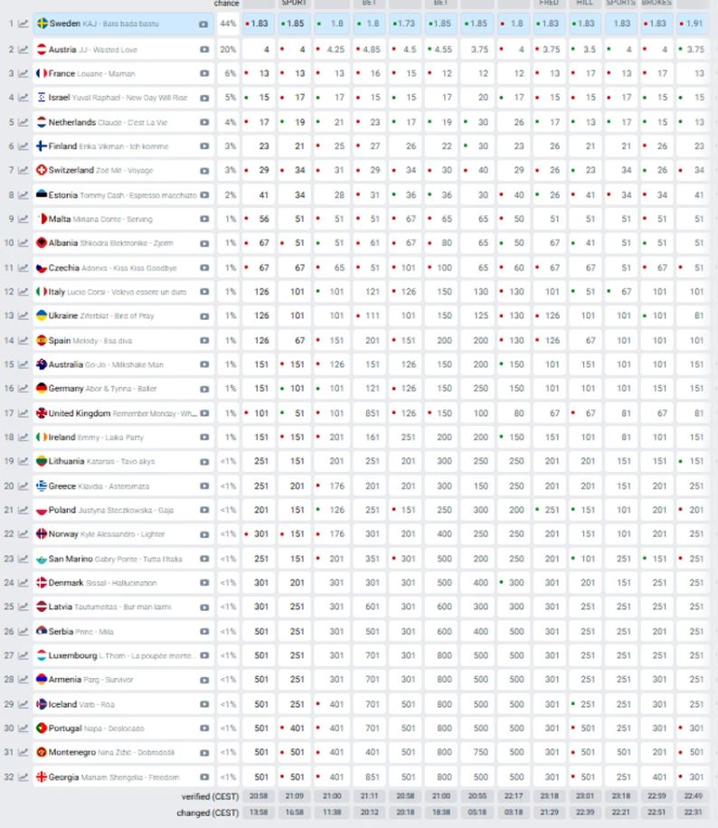 Kladionice sada pobjedu predviđaju Švedskoj, sa 44% šanse za pobjedu, a drugo mjesto zauzima Austrija.