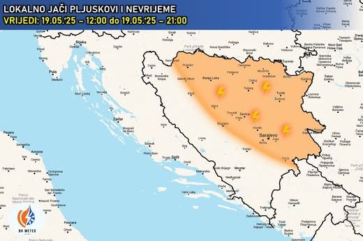 Glavnina nestabilnosti iznad sjevernih, centralnih, sjeveroistočnih i istočnih dijelova Bosne gdje se očekuje većinom kiša i lokalno jači pljuskovi sa grmljavinom, javlja BHmeteo.