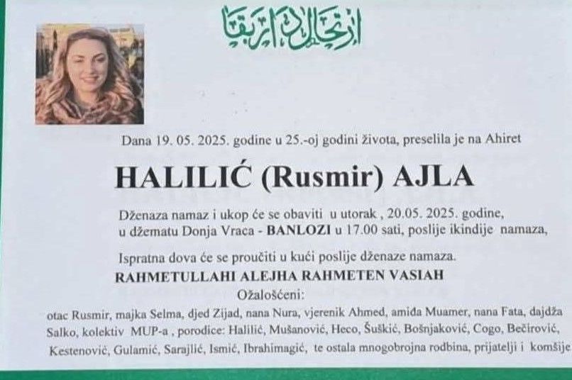 Dženaza-namaz i ukop bit će obavljeni u utorak, 20. maja 2025. godine u džematu Donja Vrca – Banlozi, s početkom u 17:00 sati, nakon ikindije namaza. Ispratna dova proučit će se u kući nakon dženaze.