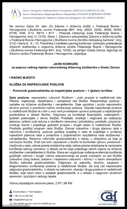 Agencija za državnu službu Federacije Bosne i Hercegovine objavila je konkurse za dvije rukovodeće pozicije u javnoj upravi – jednu u Gradskoj upravi Zenica, a drugu u Općini Kakanj.