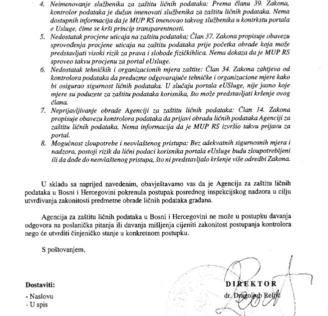 Dodatno, iz Agencije ističu kako MUP RS nije osigurao tehničke i organizacione mjere zaštite, niti adekvatne sigurnosne mjere i nadzor, zbog čega lični podaci građana mogu biti izloženi zloupotrebama.