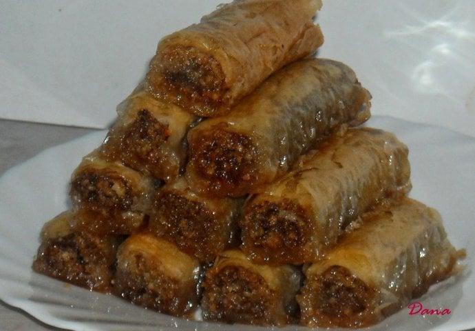 U svaku rolnicu stavljamo po 2 kore, tako da nam treba 20 kora. Fil podjeliti na 10 dijelova. Uzeti 1 koru premazati sa uljem, preko staviti drugu koru, premazati uljem. Na kraj druge kore staviti dio fila i čvrsto urolati u rolat. Staviti u pleh podmazan uljem, tako 10 puta sa svim korama i filom. Rolate premazati uljem isjeći dužine 5 – 6 cm. Peći na 180 stepeni 30 – 40 minuta dok ne dobije zlatno braon boju. Kad se ispeče toplu baklavu preliti hladnim sirupom i ostaviti da se ohladi i rolnice upiju sirup.